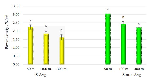 The difference between the values of S Avg and S max Avg at distances of 50, 100 and 300 m from the BTS antennas, regardless of the measured times, was evaluated. The lowest and highest values of S Avg were 0.102 and 27.370 W/m2 for 50 m, 0.021 and 21.610 W/m2 for 100 m, respectively, and ND to 21.050 W/m2 for 300 m, respectively. The lowest and highest values of S max Avg were 0.124 and 31.250 W/m2 for 50 m, 0.074, and 21.710 W/ m2 for 100 m, respectively, and ND to 34.700 W/m2 for 300 m, respectively (Figure 1).