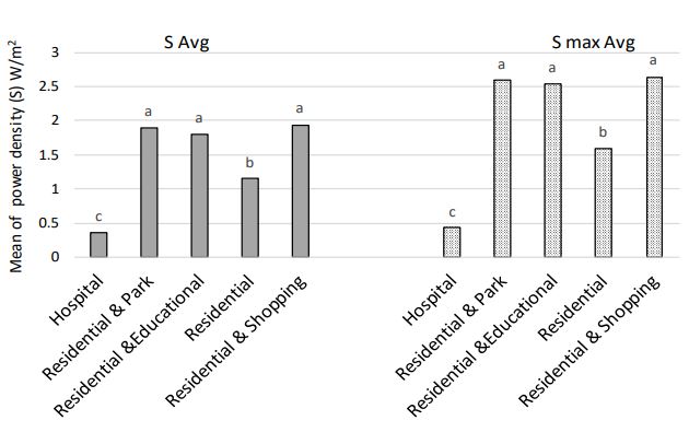 Results: Significant differences between the values of S Avg and S max Avg were detected based on distance from the BTS antennas, time measured, and type of location. For hospital, residential, residential-educational, residential-park, and residential-shopping, the average values of S Avg were 0.37, 1.15, 1.80, 1.89, and 1.94 W/m2 , respectively, and the average values of S max Avg were 0.43, 2.64, 2.54, 2.59, and 2.64 W/ m2 , respectively. There was a significant difference between S Avg and S max Avg values by microenvironment.