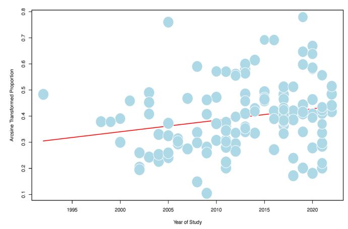 In addition, it appeared that the prevalence of IBS might be lower when individuals were interviewed rather than when they were allowed to self-administer the questionnaire. The prevalence of IBS was influenced by the mode of assessment. A recent study directly comparing the prevalence of disorders of gut brain interaction (DGBI) found that DGBI were only half as prevalent when assessed with household vs Internet surveys [25]. While, the finding of this study appears that the effect of the type of assessment is relatively small and the prevalence of IBS might be partly due to underreporting of symptoms when individuals were questioned directly. Moreover, this study showed that the prevalence of IBS has an increasing trend over time from 1990 to 2022, which is consistent with the research results published in 2012 (5). The reasons for the findings are unclear but might be as follows. First, since different criteria have been used over time, it might be accounted for the changes in prevalence of IBS. Second, it has been shown that COVID-19 led to significantly higher prevalence of Functional Gastrointestinal Disorders [22]. The included study in this metaanalysis during the COVID-19 pandemic from 2020 to 2022 are considered to increase the prevalence of IBS. Future epidemiological surveys are needed to provide the prevalence of IBS after the SARS-CoV-2 infection.
