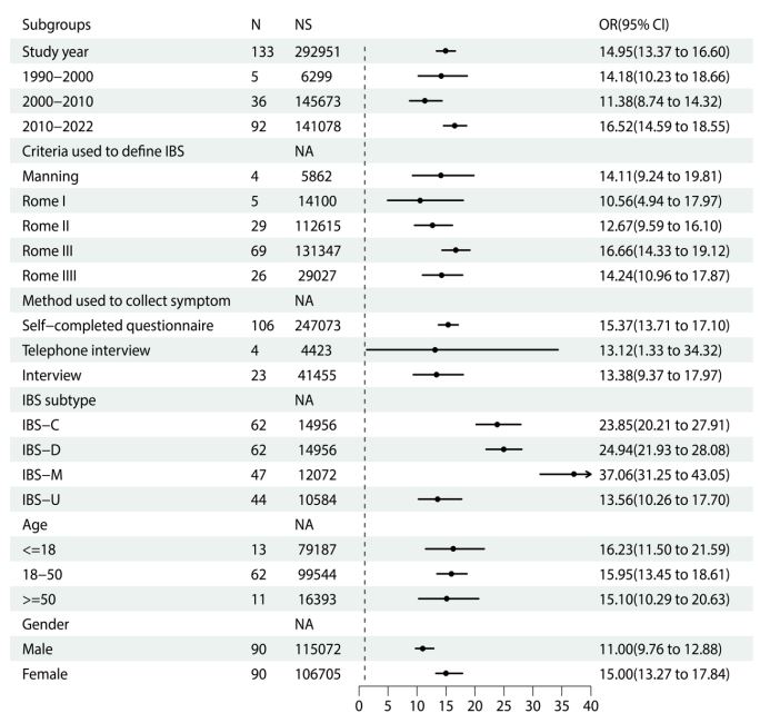 There are several limitations of this study. First, with limited generalizability considering the lack of data in some regions and countries, this study only reported 39 countries globally. Second, although the sources of heterogeneity were explored, there was significant heterogeneity between studies when data were pooled in almost all instances. It was still limited by the lack of information in the original studies, including age, sex, and subtype of IBS. This heterogeneity was not explained by any of the subgroup analyses we conducted. Finally, it should be noted that the diagnostic criteria for IBS in this study do not necessarily equate to a definitive diagnosis of IBS. There might be other organic conditions, including celiac disease, small intestinal bacterial overgrowth, or inflammatory bowel disease, that mimic IBS or lead to similar symptoms. In conclusion, more future epidemiological research reporting the prevalence of IBS in the general population is needed, in particular the SARSCoV-2 infection.