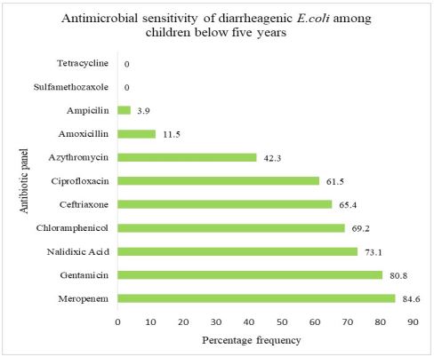 Antimicrobial sensitivity of diarrheagenic Escherichia coli isolated from children aged below five years: The antimicrobial sensitivity patterns of 26 diarrheagenic E. coli showed highest sensitivity patterns to various antibiotics; Of these 22(84.6%) diarrheagenic E. coli positive isolates were sensitive to Meropenem, 21(80.8%) of the diarrheagenic E. coli were sensitive to Gentamicin, 19(73.1%) diarrheagenic E. coli positive isolates showed sensitivity towards Nalidixic acid and 18(69.2%) of the diarrheagenic E. coli positive isolates were sensitive to Chloramphenicol Figure 2.