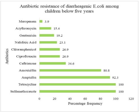 Antimicrobial resistance patterns of diarrheagenic Escherichia coli isolated from children aged below five years: The antimicrobial resistance of 26 diarrheagenic E. coli isolates showed 100% resistance to tetracycline and SulfamethoxazoleTrimethoprim. Of the positive diarrheagenic E. coli isolates, 24(92.3%) showed resistance towards ampicillin and 21(80.8%) showed resistance to Amoxicillin (Figure 3).