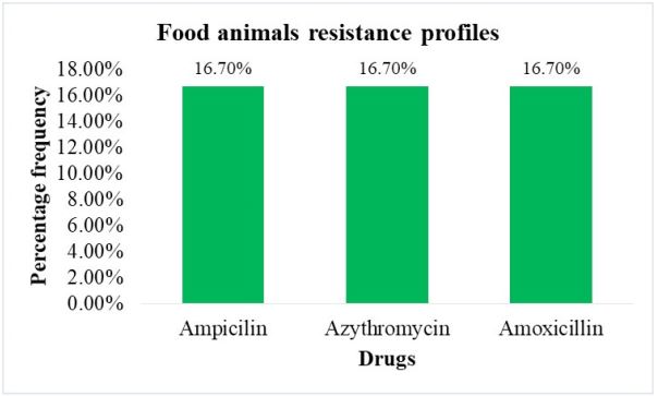 Analysis of food animal samples showed sensitivity towards most of the antibiotic that were used for treatment of DEC. This reveals the low usage of antibiotics in the food animals feeds and water in the farms by farmers for the purpose of growth promotion that creates favourable conditions for selection and spread of resistant bacteria within animals. These findings contrasts those from a study performed in south Africa that reported resistance towards similar antibiotics to food animals. However, reported resistance below 20% to Ampicillin, Azithromycin and Amoxicillin, the low resistance cannot not be ignored since it reveals that animal products pose a public health risk [11].