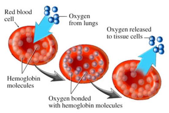 Hemoglobin is a protein complex containing iron, which plays a critical role in oxygen transport within the bloodstream. Hemoglobin molecules aggregate within red blood cells (erythrocytes), which are characterized by their distinctive biconcave, disc-like shape. Each hemoglobin molecule consists of four heme groups, each of which provides a binding site for one oxygen molecule. Consequently, a single hemoglobin molecule can bind a maximum of four oxygen molecules, representing its full oxygen-carrying capacity [6].