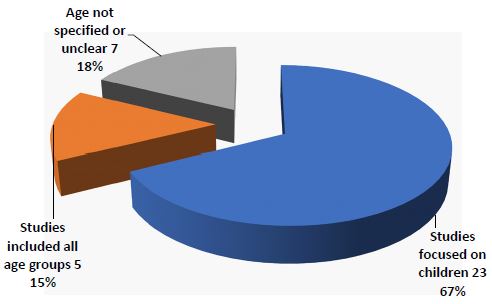 Based on the reviewed 34 studies, participants’ ages were categorized into three main groups (Table stud-). studies focused specifically on children or pediatric populations, highlighting the predominance of otitis media in younger age groups. Thirteen studies included all age groups, while four studies did not clearly specify participant ages.