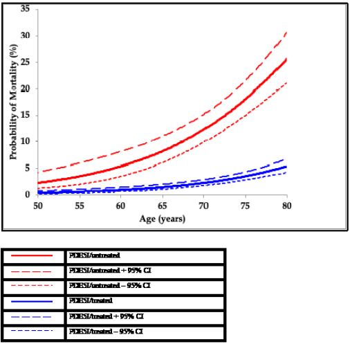 We initially established that in our cohort of 857 men mortality was exponentially related to age; age and Ln of the mortality showed a linear association [21]. Following that logistic (and logit) regression analysis was performed to confirm the association between death/survival (dichotomous dependent variable) and age at death or last clinical assessment as the independent variable (Table 1 – model 1). Subsequently the effect of TTh and PDE5I on the association between age and mortality was evaluated. We used separate logistic regression models (Table 1–Models 2 and 3) with TTh and PDE5I included with age at death or final visit as the independent variables and death as the dependent variable. TTh and PDE5I status as discrete ordinal variables were factorised with one category selected as reference (TTh/untreated and PDE5I/untreated) and the treated groups (TTh/treated and PDE5I/treated) compared. Treatment with TTh (Table 1-Model 2) and PDE5I (Table 1–Model 3) demonstrated significantly lower mortality, compared to their untreated counterparts. To graphically illustrate the impact that treatment had on age related mortality, we calculated the probability of mortality (and 95% CI) for each man using the separate logistic regression models (Table 1–Models 1-3). The probability of mortality for every individual, based on treatment status (treated/untreated) was plotted against age (Figures 2 & 3). This clearly showed that TTh and PDE5I altered the association between age and mortality [21]. Figure 4 demonstrates the Absolute Risk Reduction (ARR) and Relative Risk Reduction (RRR) when a man with functional hypogonadism is on TTh [24].