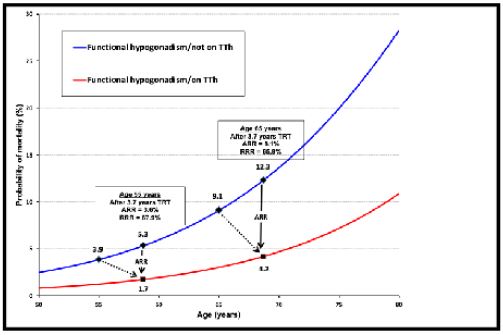 Patients with functional hypogonadism were referred to the Metabolic Clinics by primary and secondary care physicians and assessed in accordance with the then current BSSM guidelines [11,24,25]. The current evidence based on guidelines was discussed with functional hypogonadism focusing on the benefits and potential adverse effects of treatment [11,25]. In men with T2DM where functional hypogonadism is highly prevalent, the evidence was augmented by Figures 2-4. Figures 2 and 3 very clearly demonstrate the mortality decrease associated with TTh and PDE5I use, whilst Figure 4 adds numerical values (ARR and RRR) to the visual benefit at ages 55 and 65 years. We expected that this graphical display of benefit and the doctor-patient interaction that followed may have improved treatment adherence. It is important that the characteristics of the BLAST screened cohort was emphasised and the patients were aware that the results strictly speaking only applied to men of similar presentation phenotype.